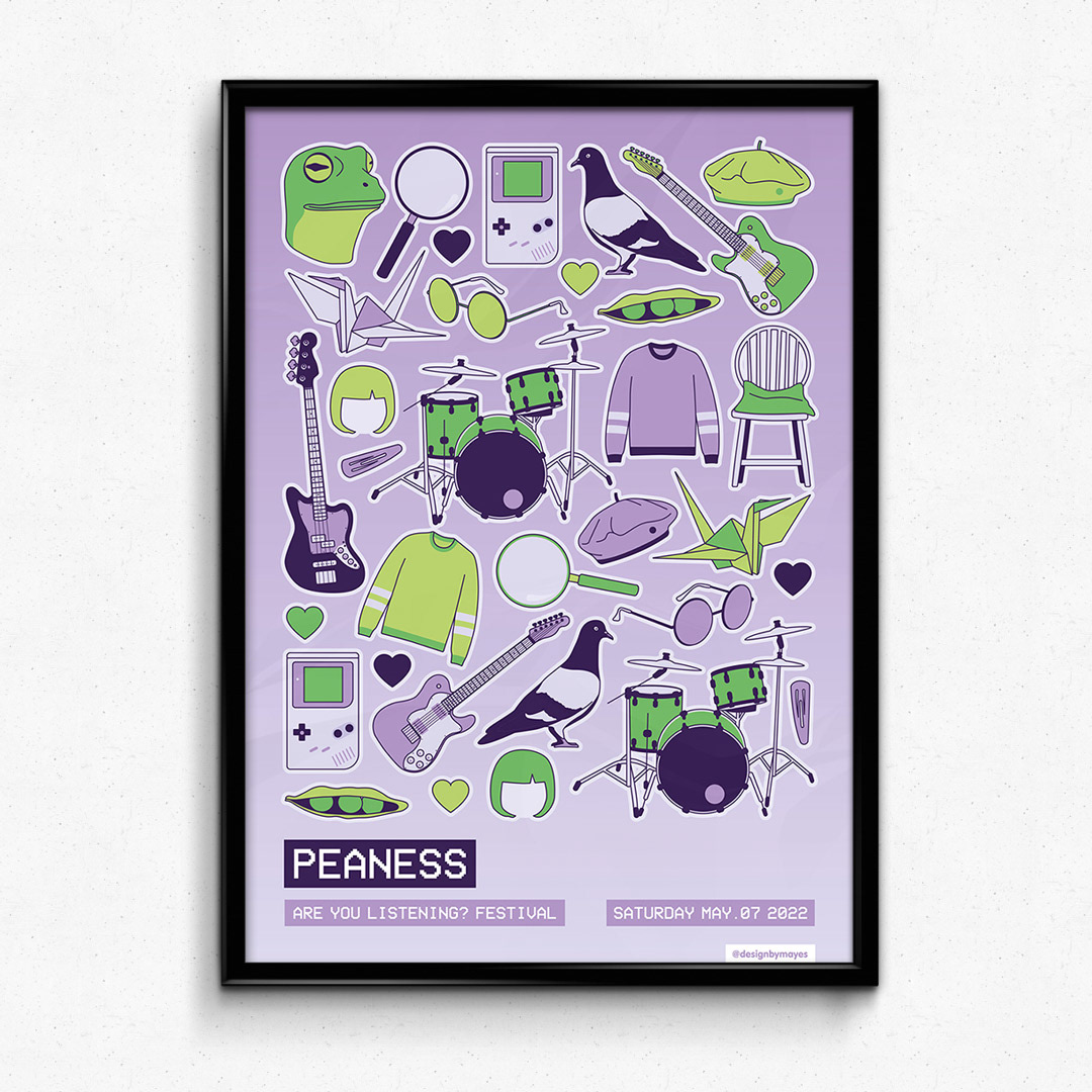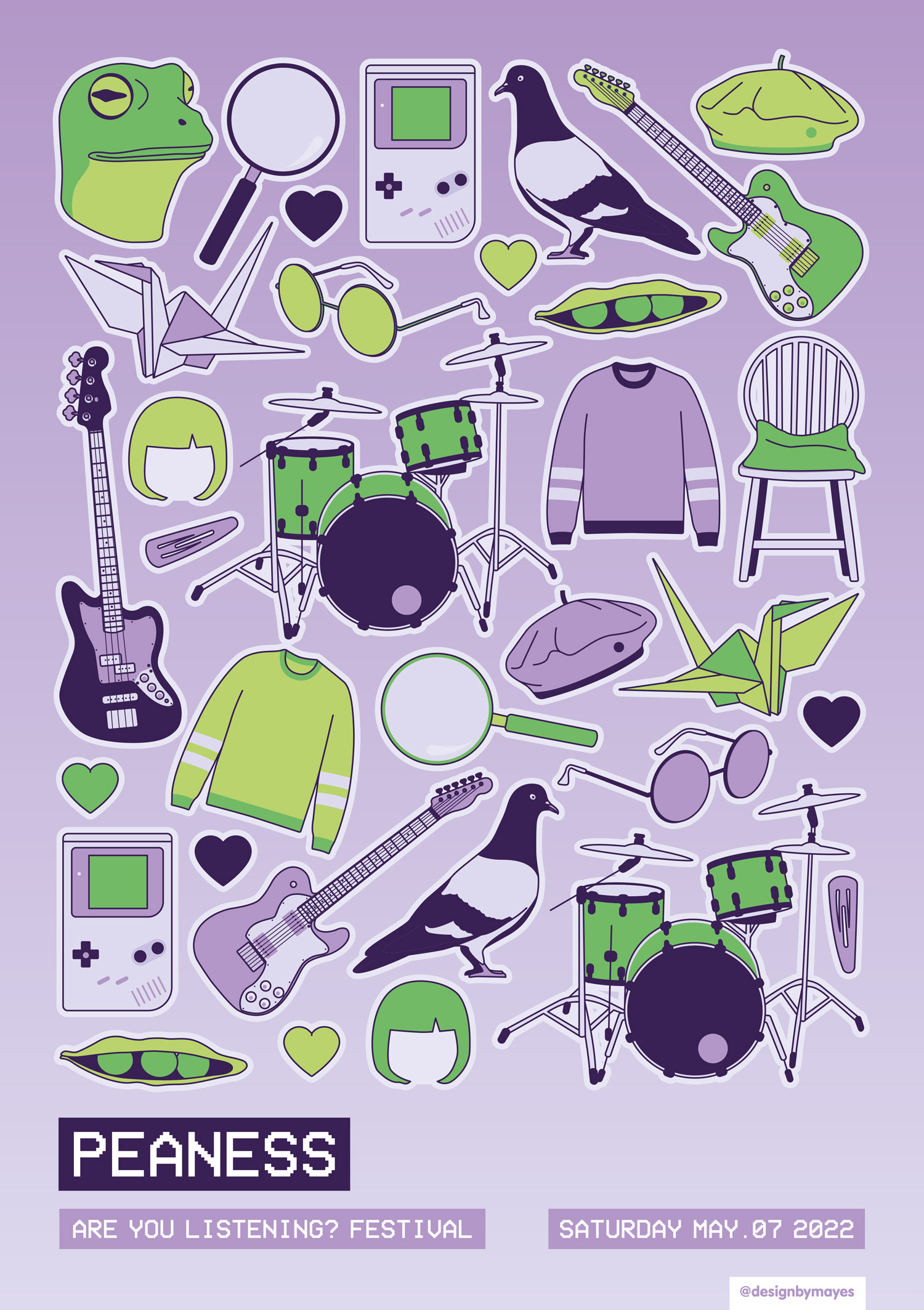 Brief: Each year, Are You Listening? recruit ten local artists to create one-off posters for an act playing the festival. These posters are exhibited before and during the festival before being sold in a blind auction with all the money raised going to Reading Mencap. Chosen to design a poster for Chester-based indie-pop band Peaness, I created a digital scavenger hunt of sorts, based on their catalogue of music videos.