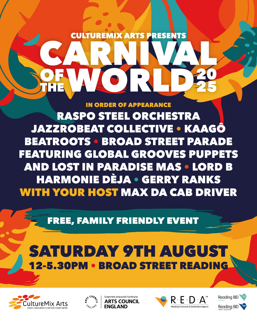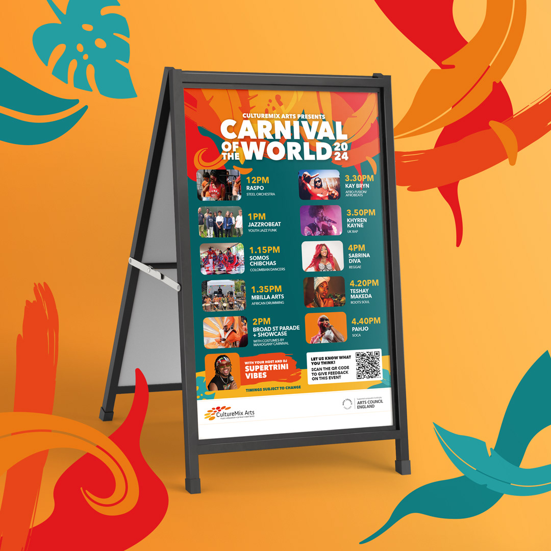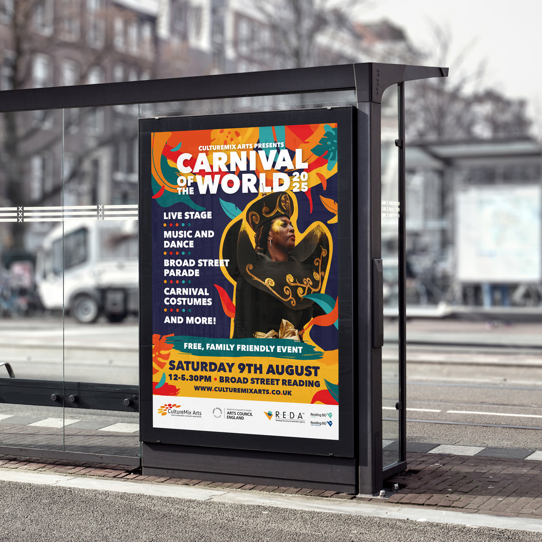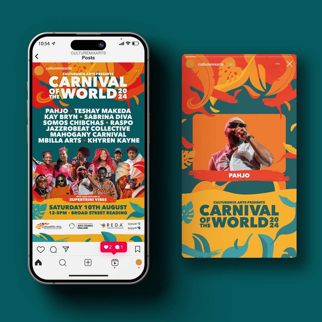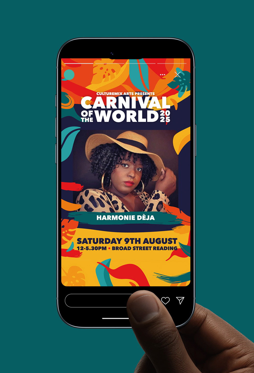 Brief: CultureMix Arts are a carnival arts organisation based in Reading. Their annual ‘Carnival of the World’ event showcases a range of acts from soca to reggae music artists to mas bands. They were looking for a new defined look and feel for the event that they could take forward for years to come. With a fixed logotype already in place, I created a visual toolkit of backgrounds and colours that could be used interchangeably across physical and digital materials.