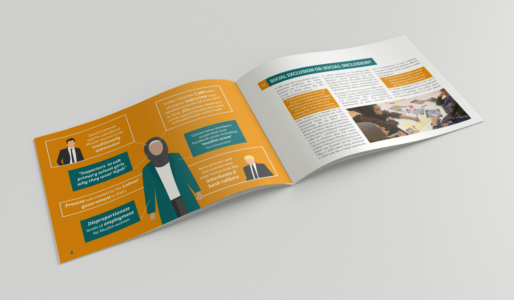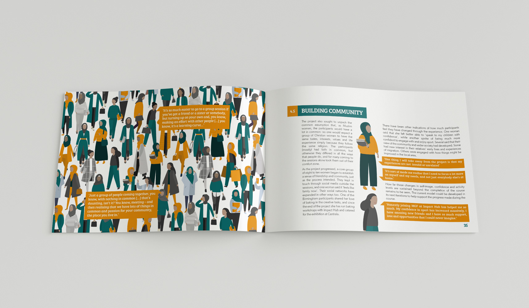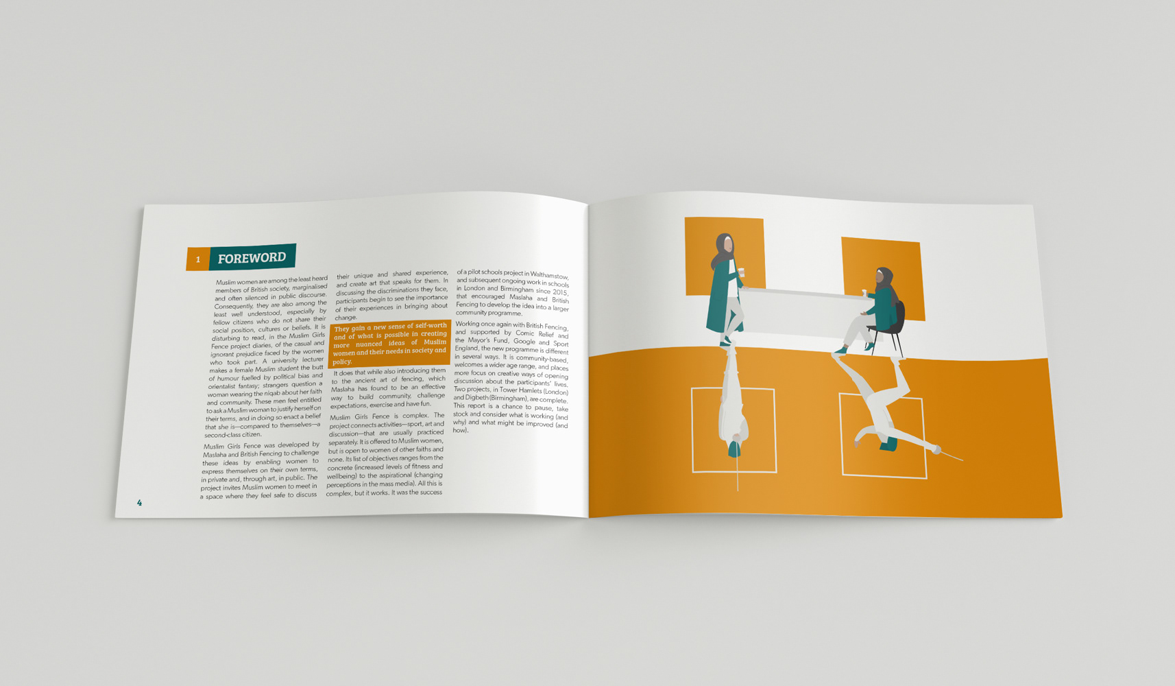 To design the report evaluating the Muslim Girls Fence project. Maslaha were keen for the document to look exciting and engaging; steering clear of the stereotypically dry idea of a report.