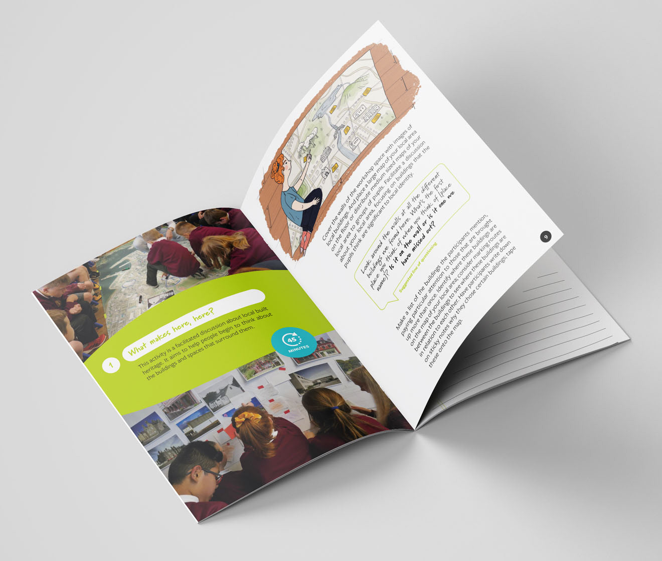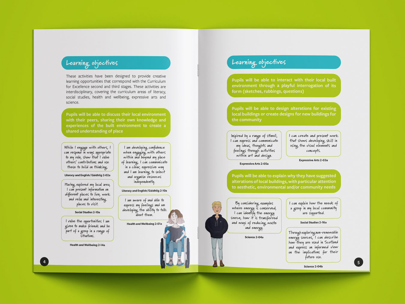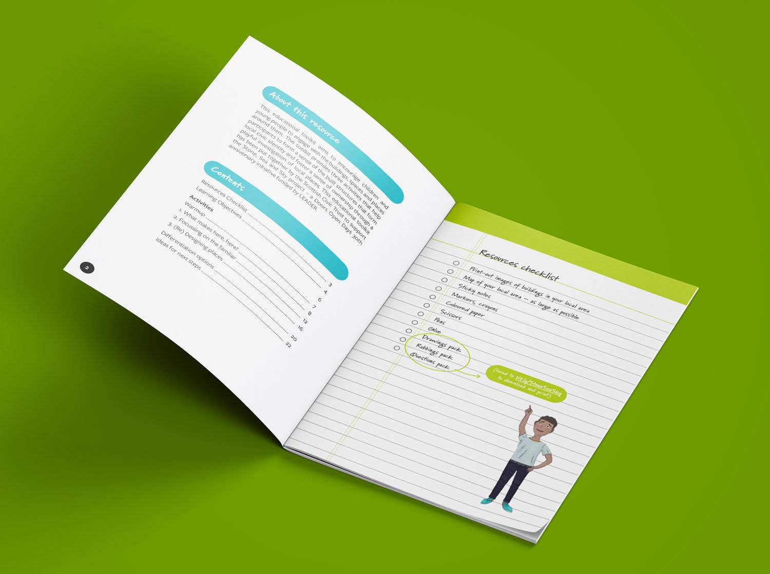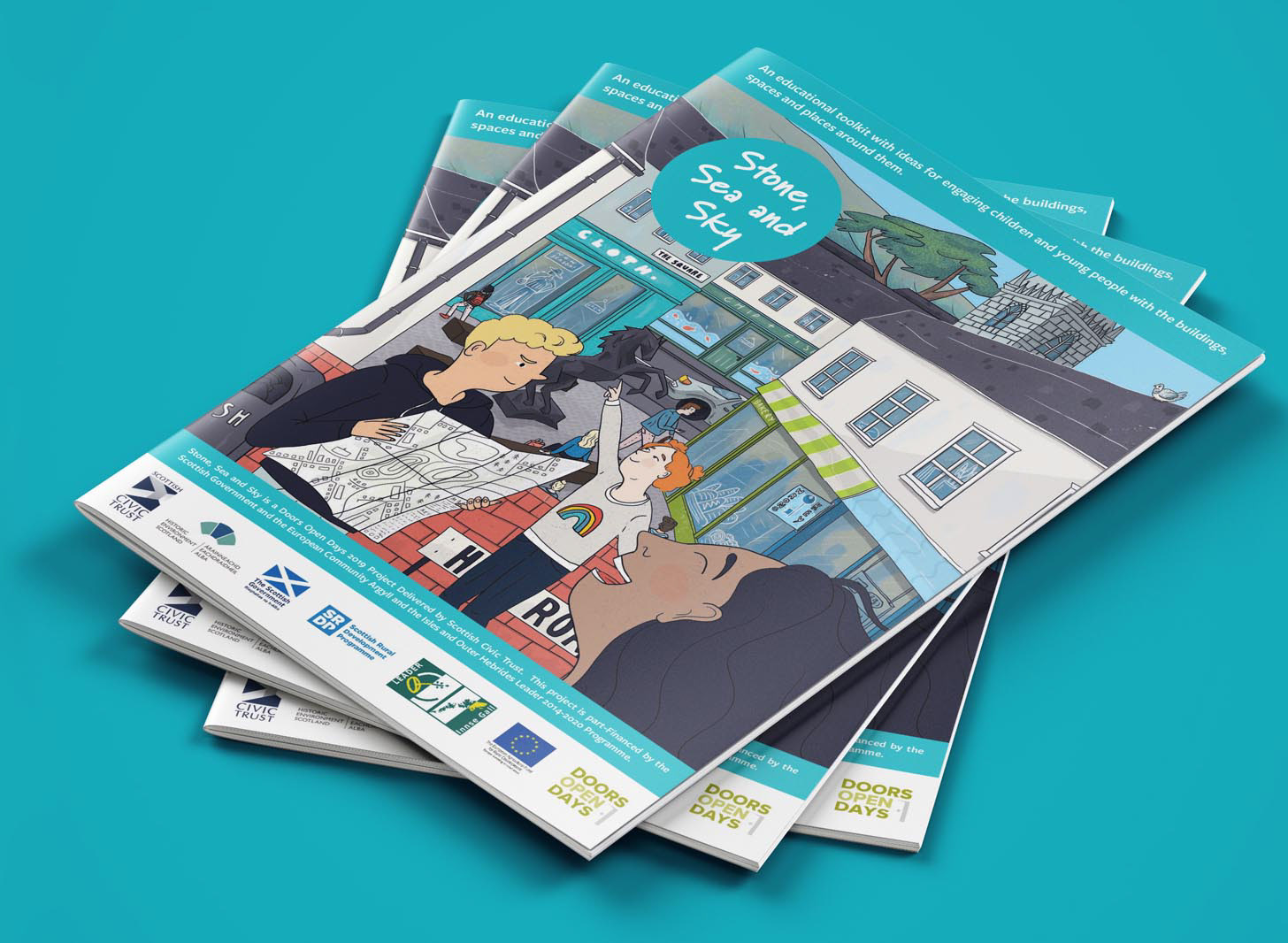 Brief: The trust wanted to create a bilingual educational toolkit as the final legacy of the Doors Open Days 30th anniversary project, Stone, Sea and Sky, which celebrated the architecture and communities of Scotland's islands. The toolkit would provide a simple, free, downloadable guide that teachers and adults could use to engage children in their local built environment, raising awareness of and promoting connection to the architectural and cultural heritage. It would also increase the brand awareness of Doors Open Days in Scotland's rural and remote areas. In collaboration with illustrator Saffron Russell, an eye-catching, youthful booklet was designed to engage and inform educators in a clear, yet fun way.