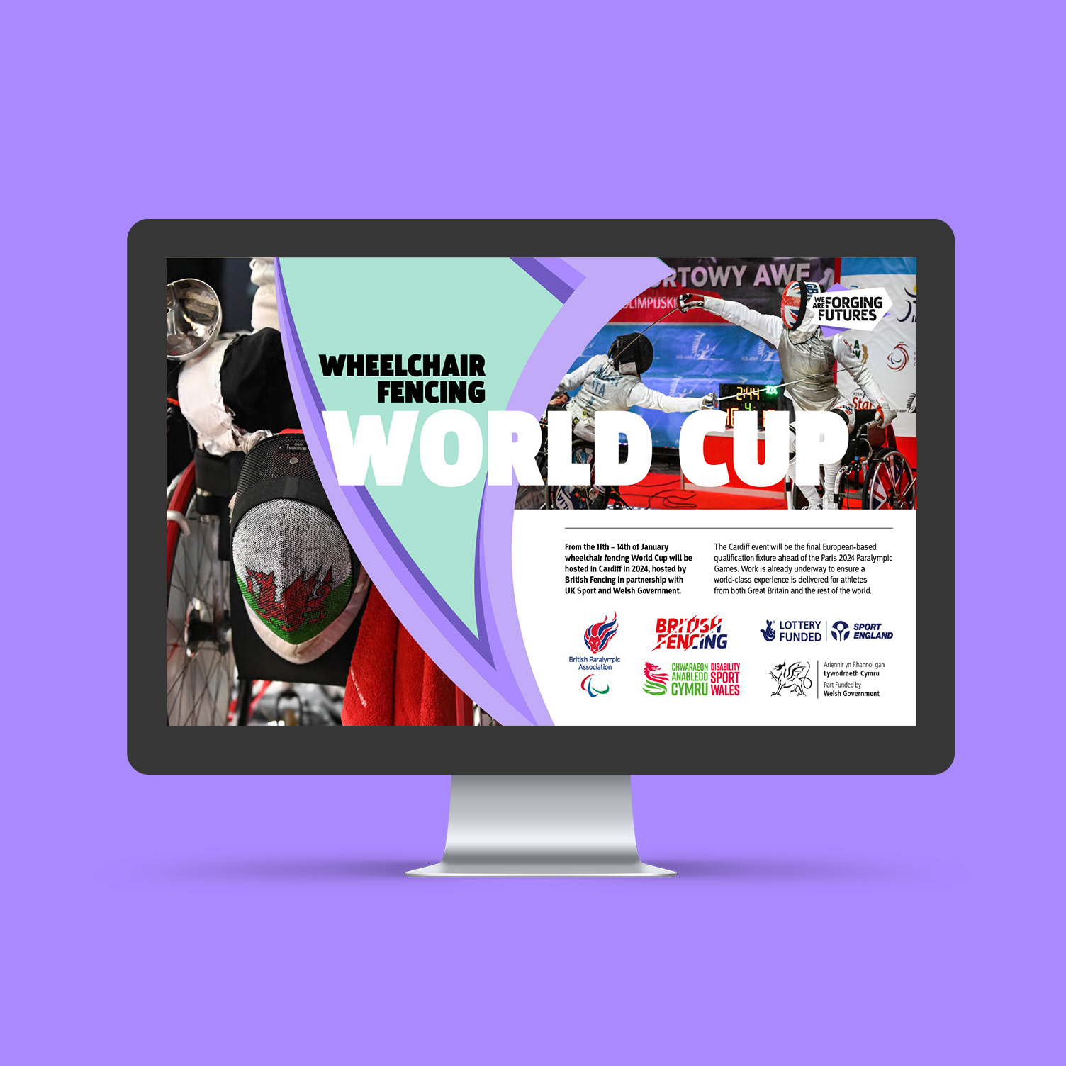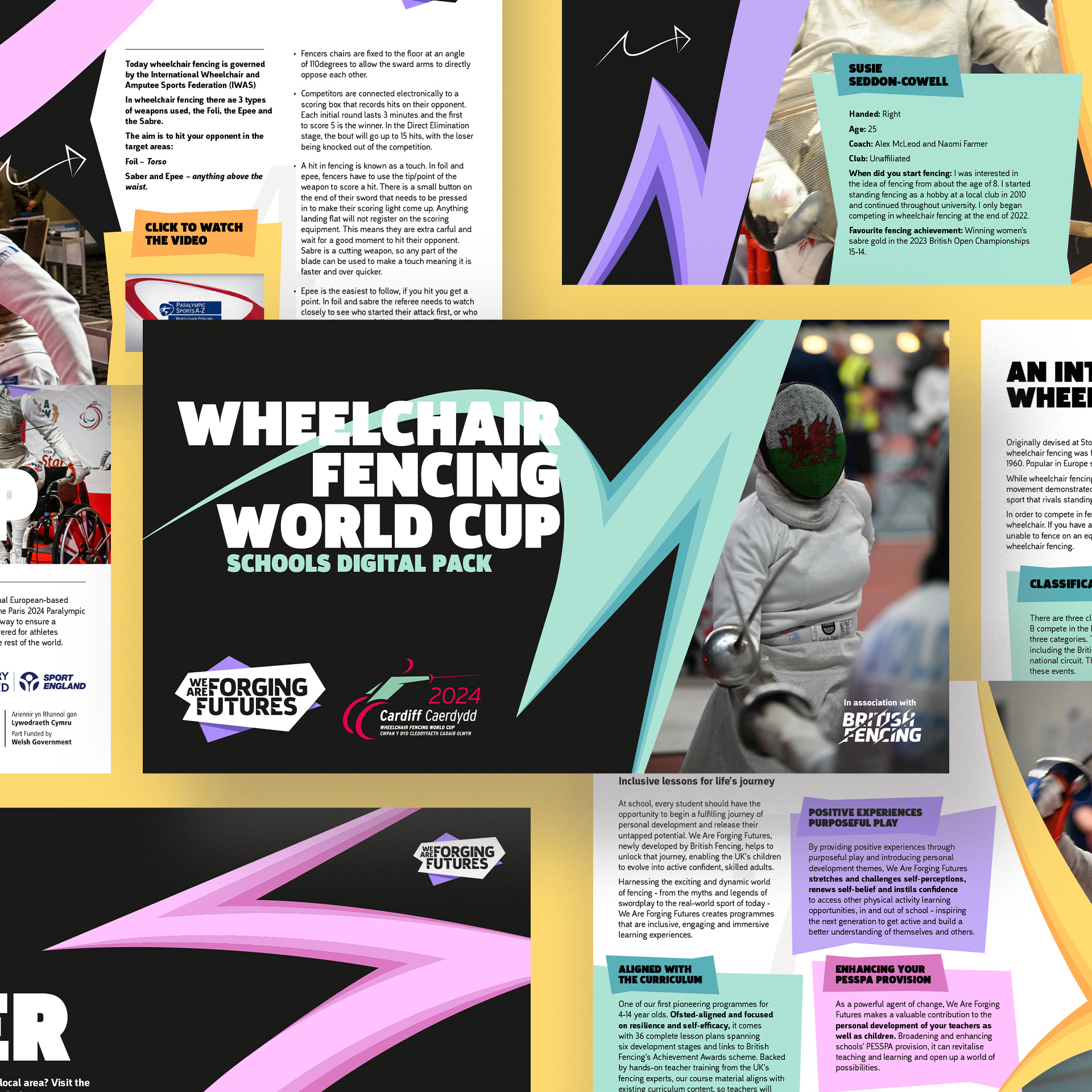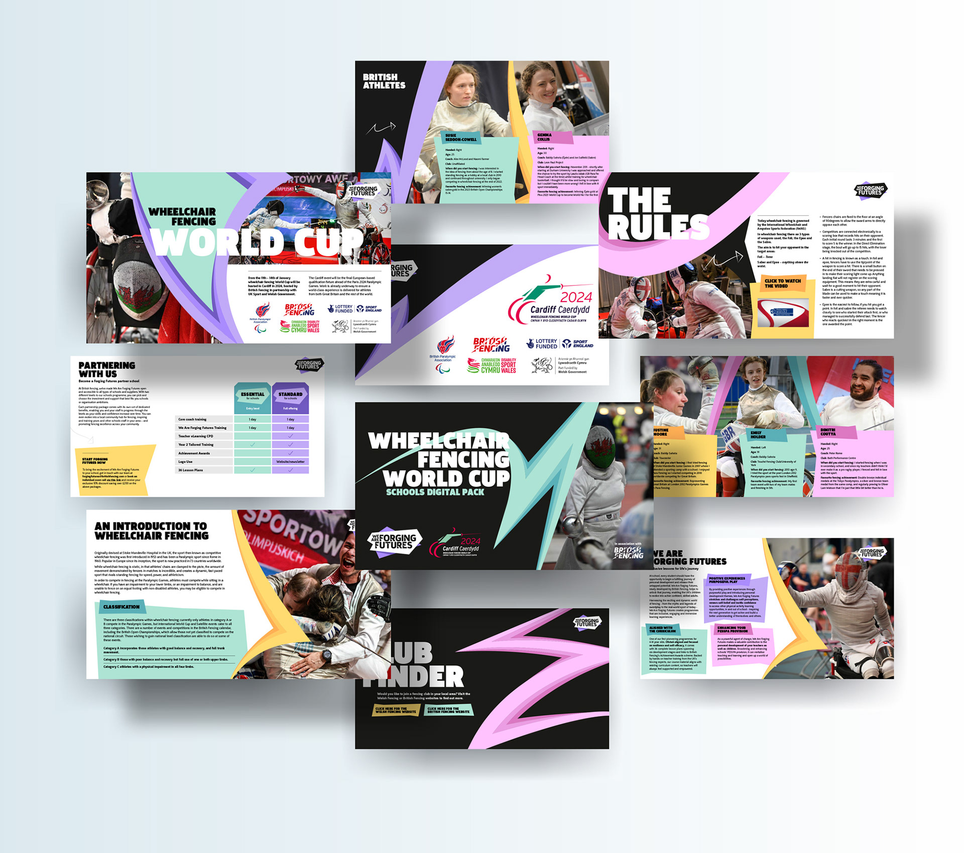 Brief: In connection with the Wheelchair Fencing World Cup 2024, British Fencing commissioned a range of materials for engagement with school partners. Following the We Are Forging Futures brand guidelines, a set of documents were created in English and Welsh to encourage teachers and their pupils to get involved with the event.